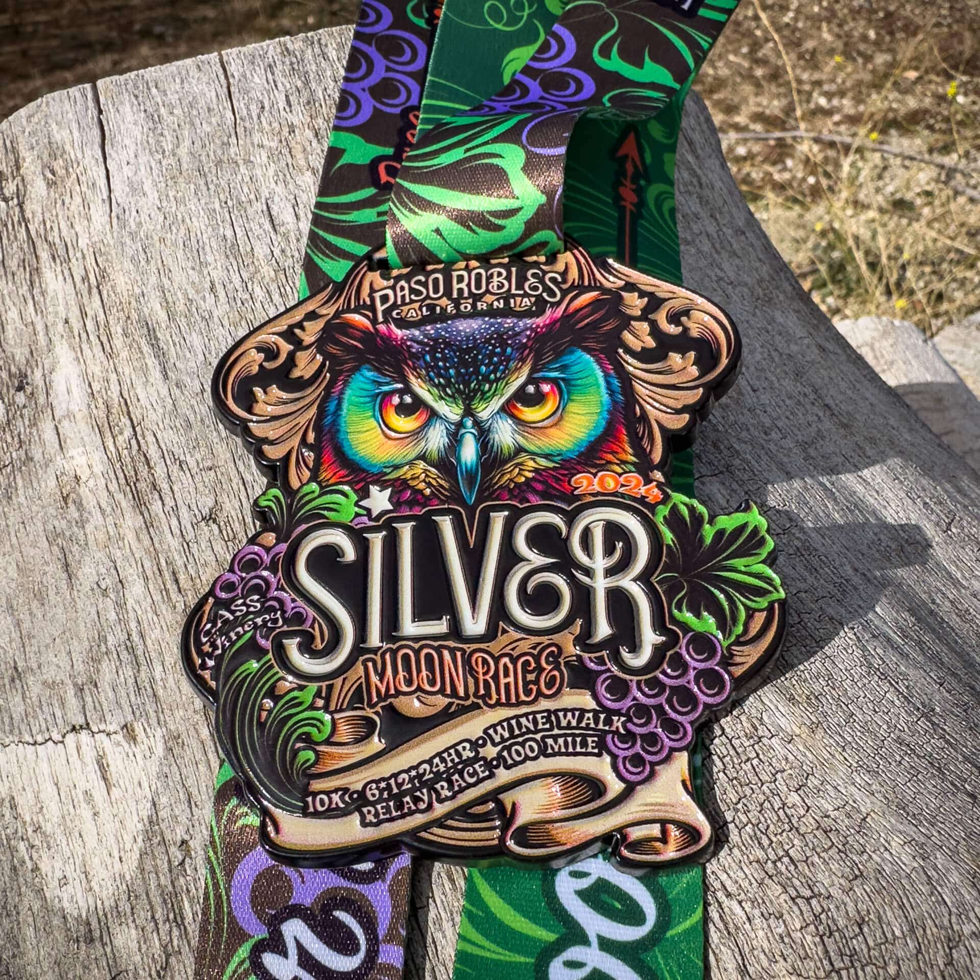 Choose to run a 5K, 10K, Half Marathon, or longer distance and earn the beautiful and massive Silver Moon Race Rainbow Feathered Owl medal design in the vineyards with a beautiful ribbon to match.